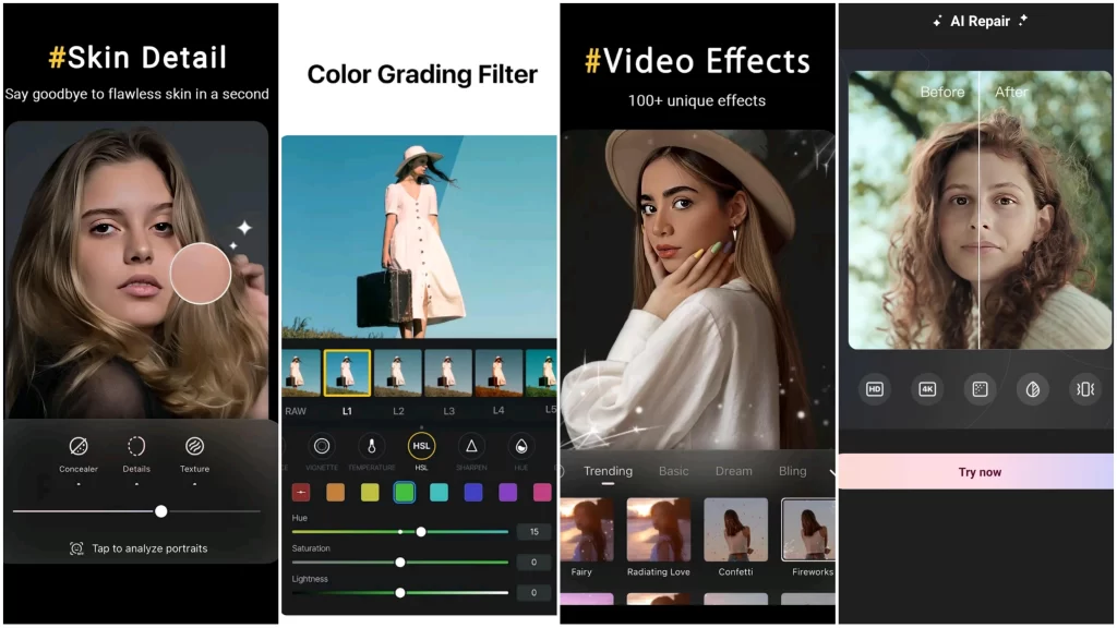 - AI-Powered Beauty Tools: It has smart filters that automatically enhance faces in videos. It can remove blemishes whiten teeth or slim features – all with one tap.
